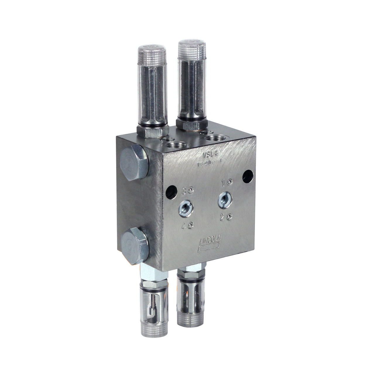 The durable, galvanized steel VSL metering devices are designed for dual-line systems with pressures of up to 400 bar (5800 psi). These metering devices are available with up to eight outlets, and each pair of outlets is equipped with an indicator pin for visual monitoring. Also, the VSL metering devices are available with low-wear proximity switches, or piston detectors, for electrical monitoring. Additional features include rust-resistant material.