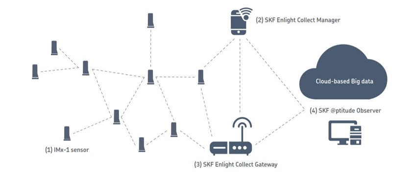 SKF Enlight Collect IMx-1 system consist of an autonomous battery powered wireless vibration and temperature sensor, a line powered communication and network manager gateway, an host software for data trending visualization and analysis and a mobile phone app for sensor and gateway commissioning.