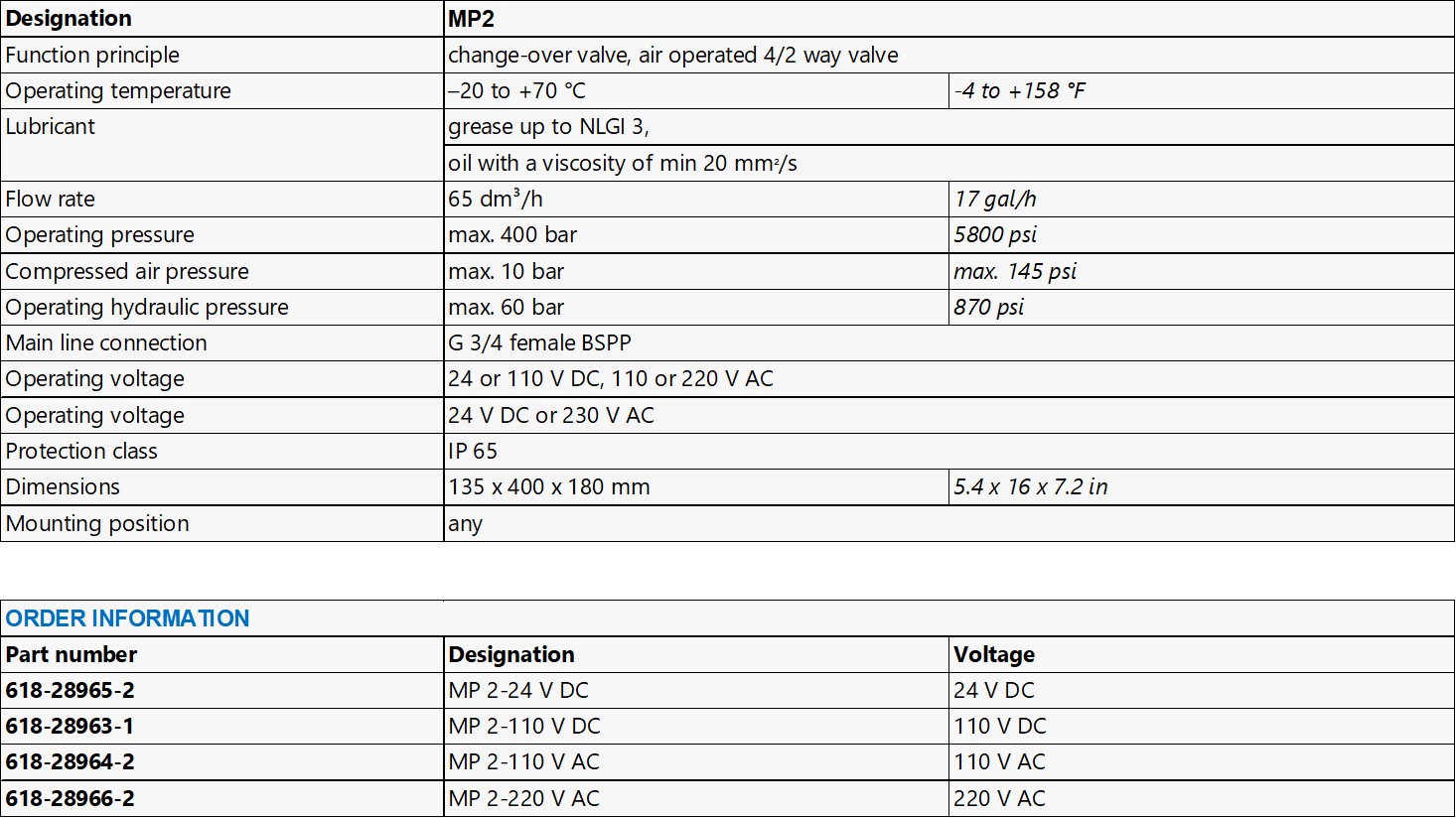 Designed for use in dual-line systems, the pneumatically operated MP 2 change-over valve works like a 4/2-way valve. It alternately discharges the lubricant fed by the pump into one of the main lines while the other main line is connected to the pump’s return line connection.