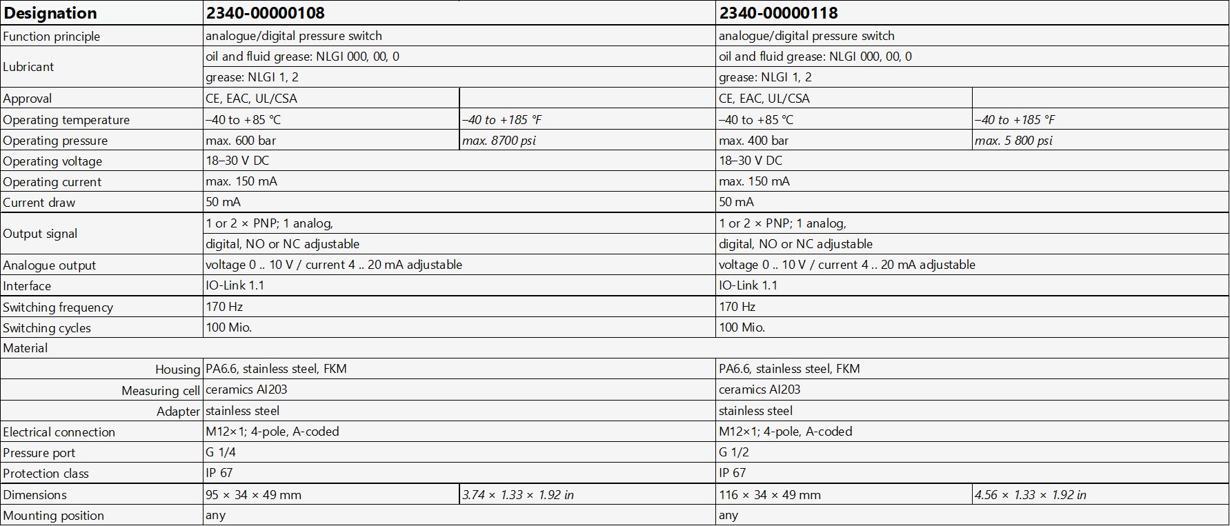 2340-00000108/2340-00000118 PRESSURE SWITCH/SENSOR