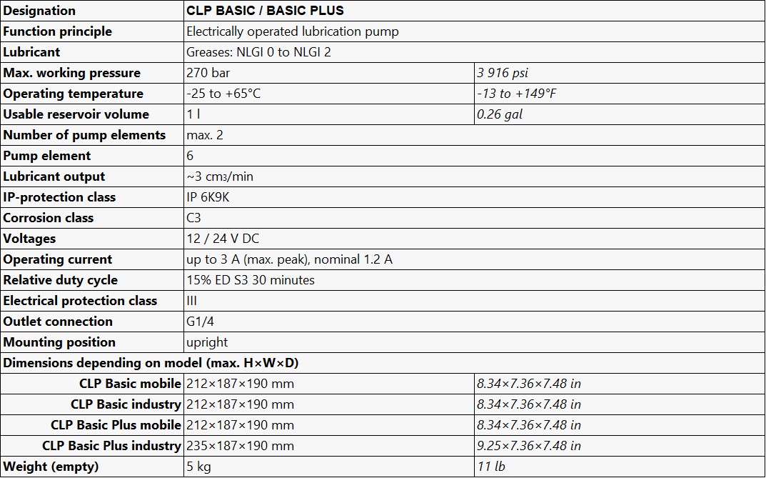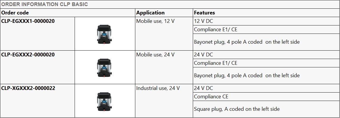 CLP는 기존 QLS 및 KFA등의 소형 펌프를 대체할 차세대 모델로 현재 1L 탱크를 갖는 컴팩트한 펌프로 기존에 펌프 달 공간이 부족했던 소형 기계들에 사용하기 적합한 모델입니다.